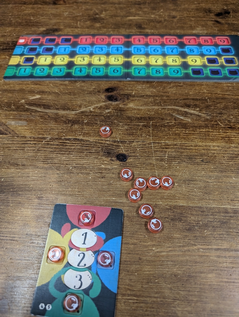 中央の数字は「自分がこのゲームで何トリック取れるか」の宣言を1~3までの数字で行います。これが正解したならば、共有ボードで自分のチップが並んだ数字分の点数を追加でもらえます。