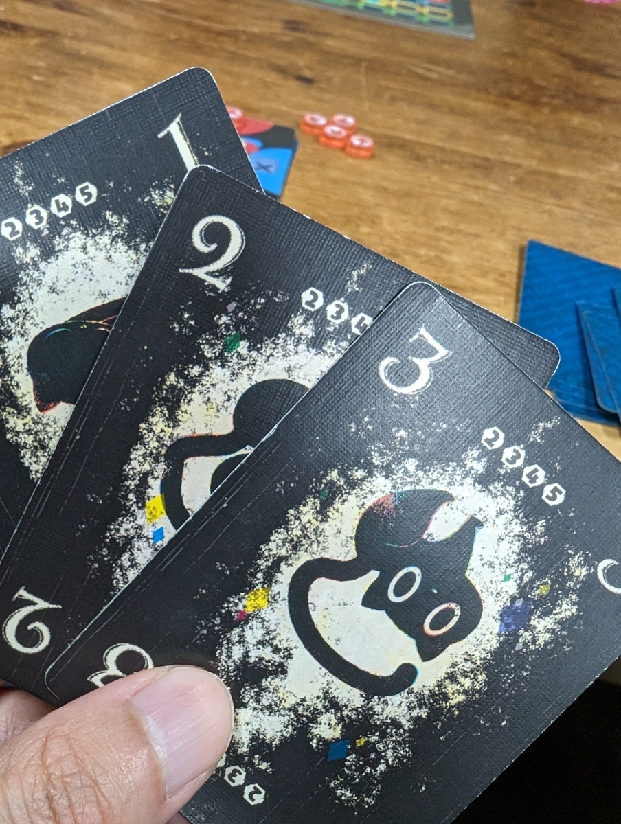 そうシュレディンガーの猫をパロディにしているわけです。カードには数字しか書かれておらず、出したとき色を宣言することで「事象を確定」していくルールとなっています。手札にあるカードが何色なのかは出すまで自分でもわからない……。